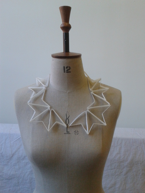 Taking my structural element into context, I began experimenting with triangular components on the mannequin, keeping my metal project in mind also, considering these models as statement neck pieces.